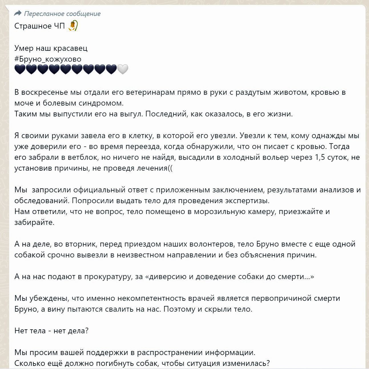 Когда я пришла открывать вольер, чтобы выгулять Бруно, он был сгорбленный, как борзые с выгнутой спиной, бока раздуты, взъерошенный, - все волонтеры увидели, что собака в ужасном состоянии. Но почему ничего не заметил местный медперсонал, в чьи обязанности входит ежедневный осмотр животного? А работники, про которых нам говорили, что мы в приюте не нужны, потому что они будут смотреть за животными лучше нас? Почему они не увидели, что собака в таком состоянии?