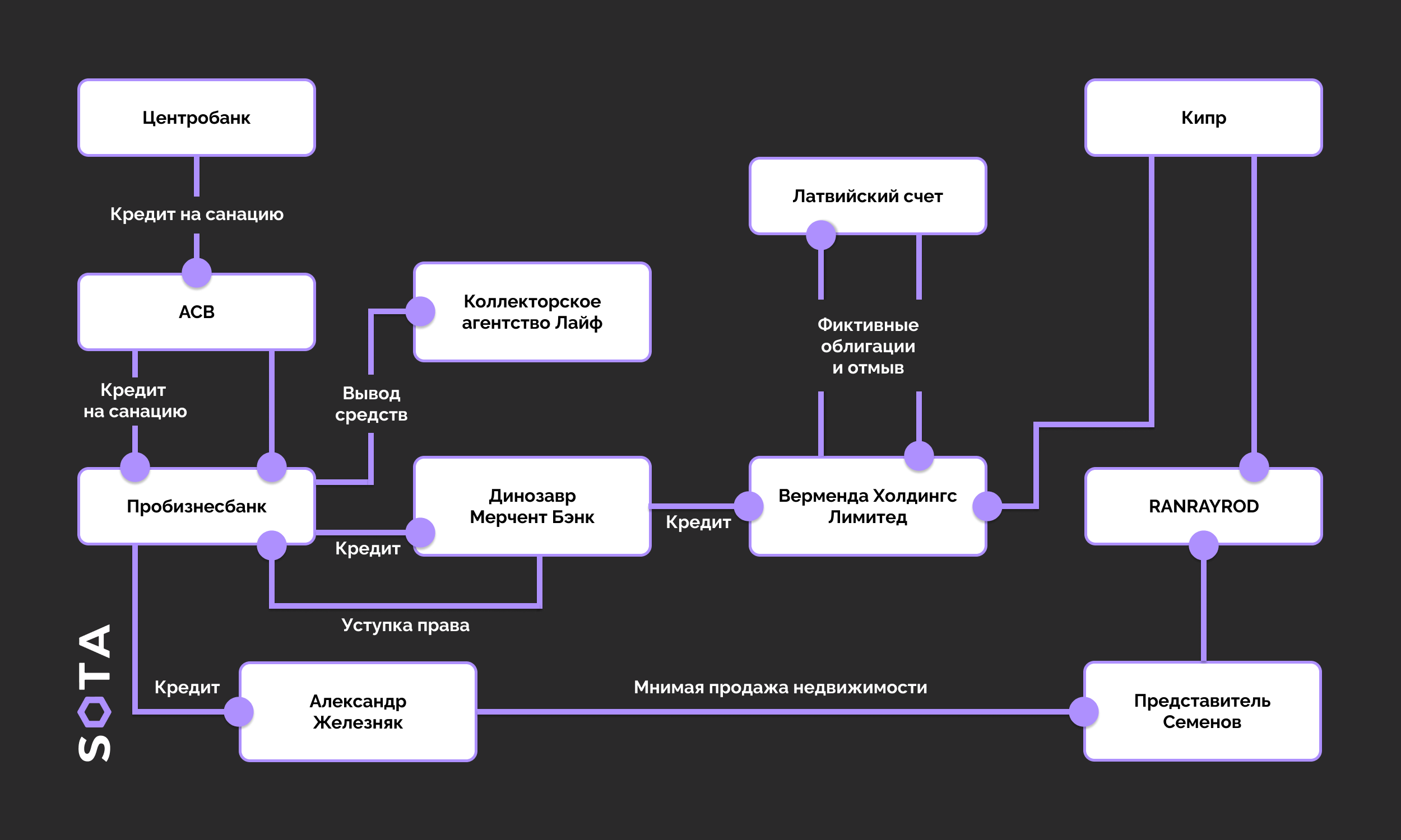 В заключение покажем схему действий господина Железняка. Специальная финансовая операция была спланирована за несколько лет до краха, и к банкротству Железняк и прочие готовились основательно. В итоге деньги были перечислены на счета, подконтрольные банкирам компании, и аккумулированы в ООО «Коллекторское агентство ”Лайф”» (по данным «Коммерсанта» и РБК, материалам уголовных дел) и кипрской компании Vermenda Holdings Limited.