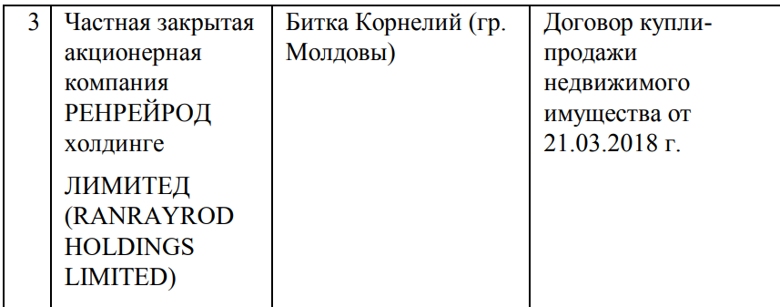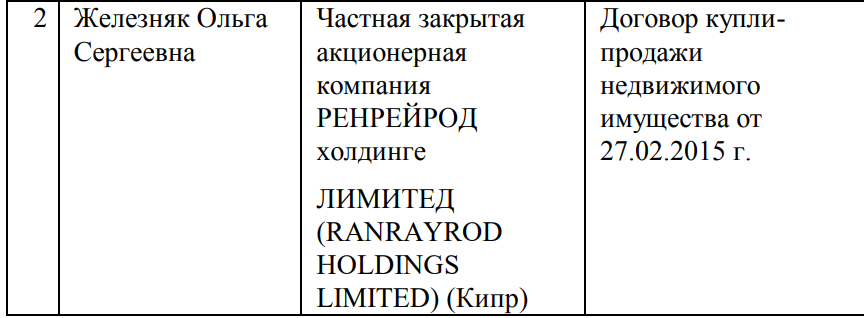 Спустя полгода после заключения кредитного договора жена внезапно «продает» недвижимость кипрскому офшору RANRAYROD. От имени офшора договор подписал Владимир Семенов, имевший с Железняком доли в общем бизнесе. Далее офшор продал активы молдавскому священнику Корнелию Битке. Примечательно, что руководителем офшора является еще один молдаванин – Георгиу Стасула. Он держит на Кипре 62 офшора и был аффилирован с Группой ПСН братьев Ананьевых, наложение санкций на которых одобрял лично Навальный. Ананьевы занимались девелопментом, недвижимостью и застройкой. С этой же отраслью бизнеса и по сей день связан упомянутый Владимир Семенов.