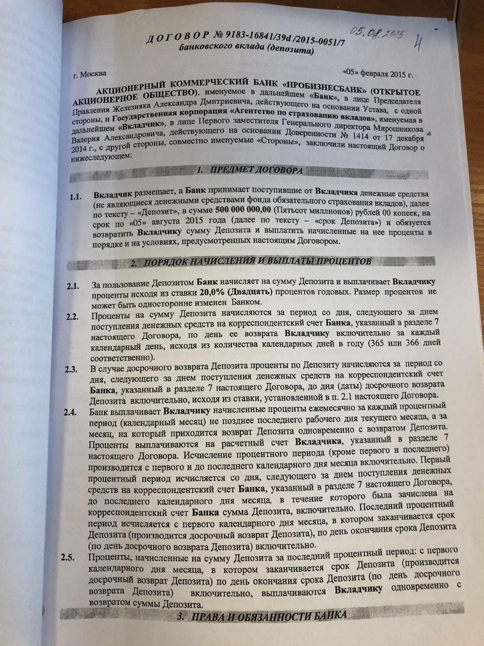 В феврале 2015 года между «Пробизнесбанком» и АСВ заключен договор банковского вклада. На депозит положили 500 миллионов рублей под 20 процентов годовых. Аккурат к отзыву лицензии АСВ получили свои деньги обратно.