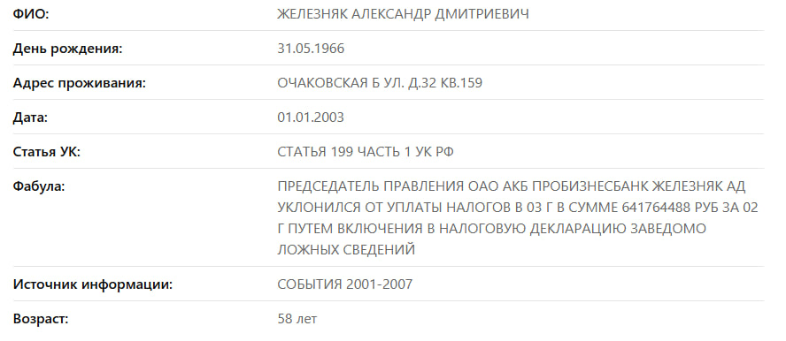 Задолго до начала активной деятельности Черкалина на своем посту Железняк уже привлекался к уголовной ответственности. События происходили в 2003 году, уголовное дело было заведено по статье 199 УК РФ – «Уклонение от уплаты налогов, сборов, подлежащих уплате организацией, и (или) страховых взносов, подлежащих уплате организацией-плательщиком страховых взносов». Уже в 2003 году Александр Железняк являлся лицом, отвечающим за принятие решений в «Пробизнесбанке». За два года Железняк, согласно ОСИНТ-данным, уклонился от уплаты налогов на сумму более 640 миллионов рублей путем подачи заведомо ложных сведений в налоговый орган.
