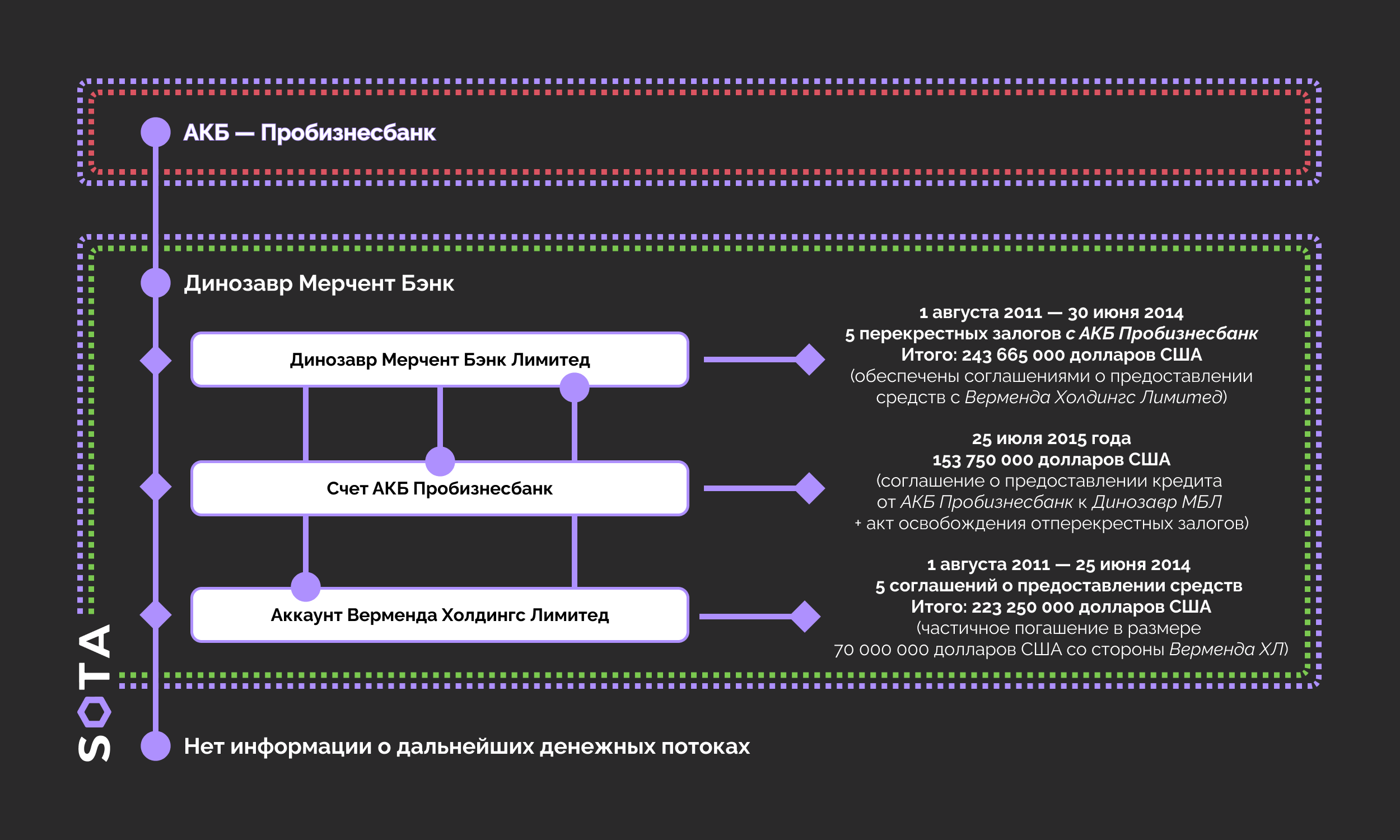 Да. Поговорим про обязательства подробнее. В 2011-2014 годах были заключены кредитные договоры между «Динозавр Мерчент Бэнк Лимитед» и «Верменда Холдингс Лимитед» от августа 2011 года, от октября 2011 года, от 16.12.2011, от апреля 2013 года, от 30 июня 2014 года. Гарантом по сделке выступил «Пробизнесбанк» — «Верменда» получила кредиты под залог активов банка Железняка, расположенных на счетах «Динозавра».