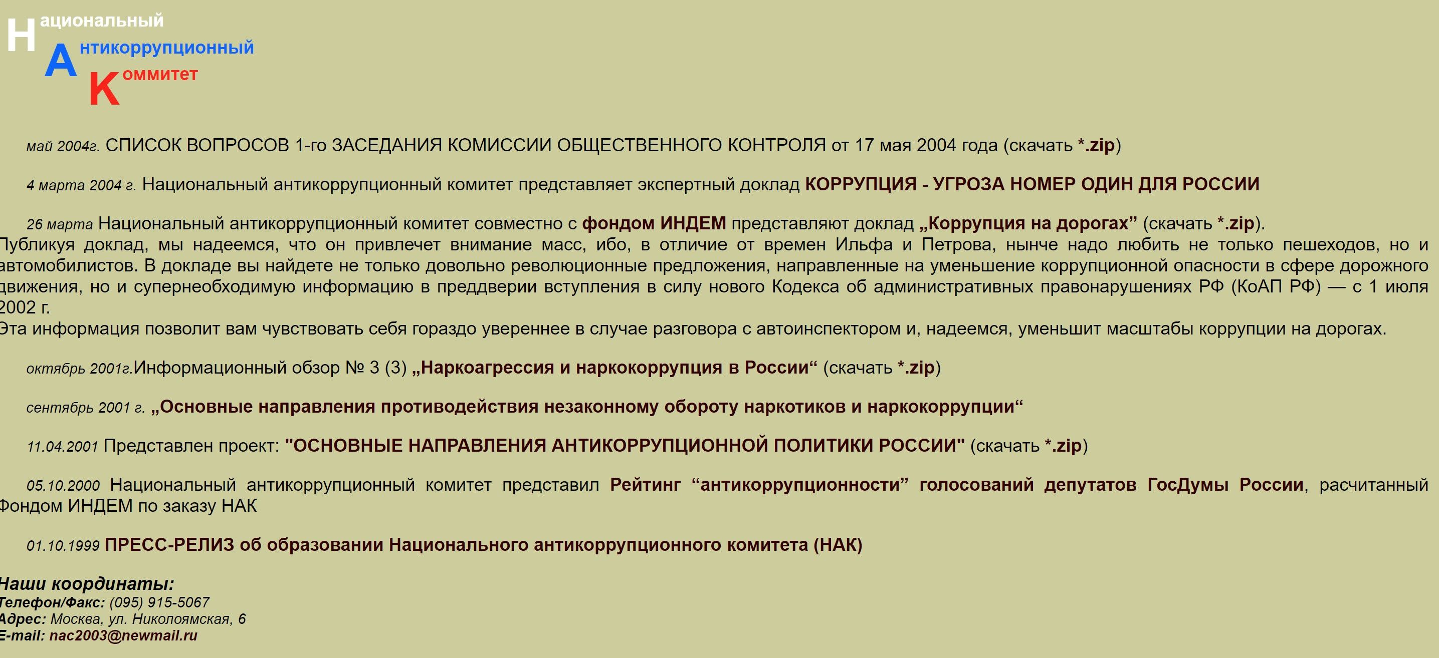 Согласно старым страницам интернета, НАК являлся подразделением Фонда ИНДЕМ, известного по своему главному представителю – Георгию Сатарову. Страница не менялась и выглядит так: