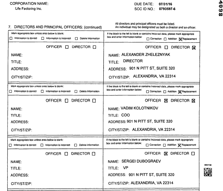10 июля 2015 года, за месяц до отзыва лицензии у «Пробизнесбанка», в США была зарегистрирована компания Life Factoring Inc. В числе основных директоров – уже известный нам Сергей Леонтьев, а также – Сергей Дубограев, сын адвоката Дмитрия Дубограева. Старший Дубограев занимался регистрацией компании. Он же подписал ее устав.