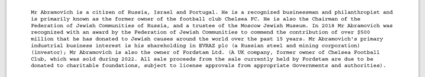Г-н Абрамович является гражданином России, Израиля и Португалии. Он признанный бизнесмен и филантроп и в первую очередь известен как бывший владелец футбольного клуба Chelsea FC. Он также является председателем Федерации еврейских общин России и попечителем Московского еврейского музея. В 2018 году г-н Абрамович был отмечен наградой Федерации еврейских общин в знак признания вклада в размере более 500 миллионов долларов, которые он пожертвовал на еврейские дела по всему миру за последние 15 лет. Основным промышленным бизнес-интересом г-на Абрамовича является его пакет акций в EVRAZ plc (российская сталелитейная и горнодобывающая корпорация) (инвестор); г-н Абрамович также является владельцем Fordstam Ltd. (британская компания, бывший владелец футбольного клуба Chelsea, который был продан в 2022 году. Все доходы от продажи, в настоящее время принадлежащие Fordstam, должны быть пожертвованы благотворительным фондам при условии получения лицензий от соответствующих правительств и органов власти).