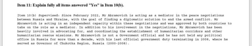 «действует в качестве посредника в мирных переговорах между Россией и Украиной с целью поиска дипломатического решения для прекращения вооруженного конфликта. Абрамович действует в независимом качестве в рамках этих переговоров и был одобрен обеими странами для принятия на себя роли посредника. Помимо своего участия в переговорах, г-н Абрамович активно участвовал в отстаивании и координации создания гуманитарных коридоров и других гуманитарных спасательных миссий. Г-н Абрамович не является государственным служащим и не занимал никаких политических должностей в России более десяти лет, его последняя официальная государственная должность закончилась в 2008 году, где он занимал пост губернатора Чукотского региона, Россия (2000-2008)».