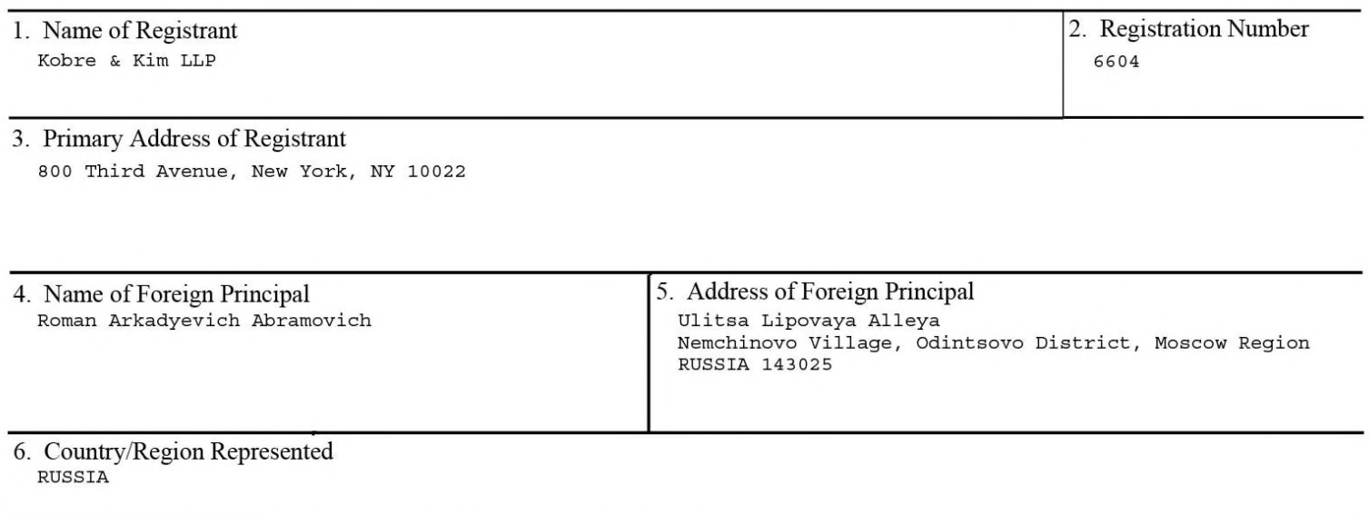 Иными словами, Абрамович, лоббируя снятие с себя санкций, по мнению администратора FARA (правительства США), не действует от своего имени и в своих интересах, а представляет интересы российского режима.