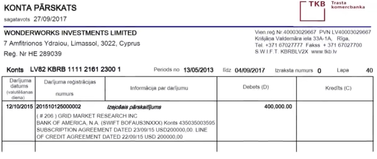 Сейчас мы говорим про лоббиста Grid Market Research, ранее упомянули офшор Wonderworks, деньги которого переводились в латвийский банк «Траста». Банк уже упоминался в расследовании о Железняке, как финансовое учреждение, где хранились деньги другого офшора – «Верменда». Счета офшоров в этом банке до его ликвидации также находились под контролем Сергея Леонтьева.