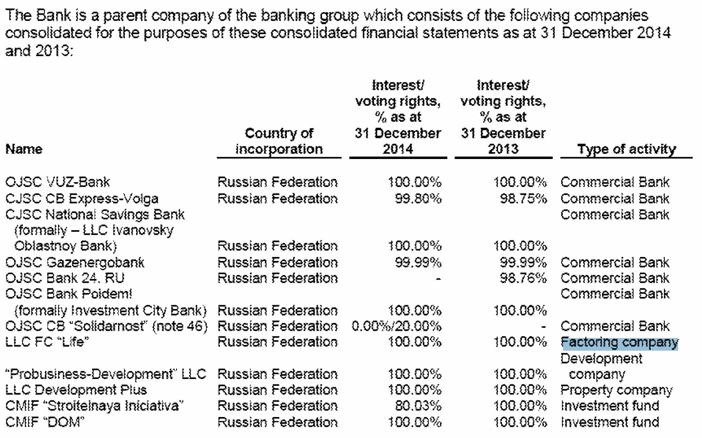 Санацию самарского банка «Солидарность» ЦБ объявил в феврале 2014 г., тогда компания «Аливикт» (через Alivikt Holdings Limited она владела 52,95% акций лишенного лицензии «Пробизнесбанка») получила кредит на финансовое оздоровление банка в размере 2,2 млрд руб. «Лайф факторинг» поручилась за «Аливикт», рассказывают человек, близкий к компании, и один из финансистов, работавших с компанией. Конечными бенефициарами Alivikt Holdings Limited на тот момент были Александр Железняк, Сергей Леонтьев и Эльдар Бикмаев.Ведомости, 2019 год.